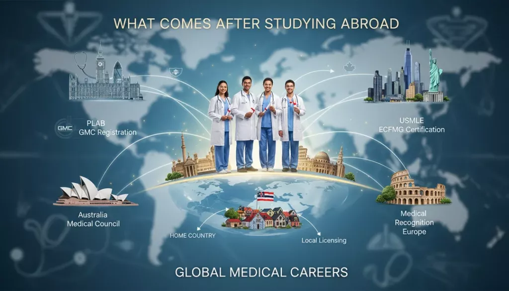 A medical degree earned abroad can open doors globally. Graduates may pursue careers in the UK (through licensing pathways such as PLAB and GMC registration), Europe, the USA (through USMLE and ECFMG certification), Canada, Australia, and their home country.
